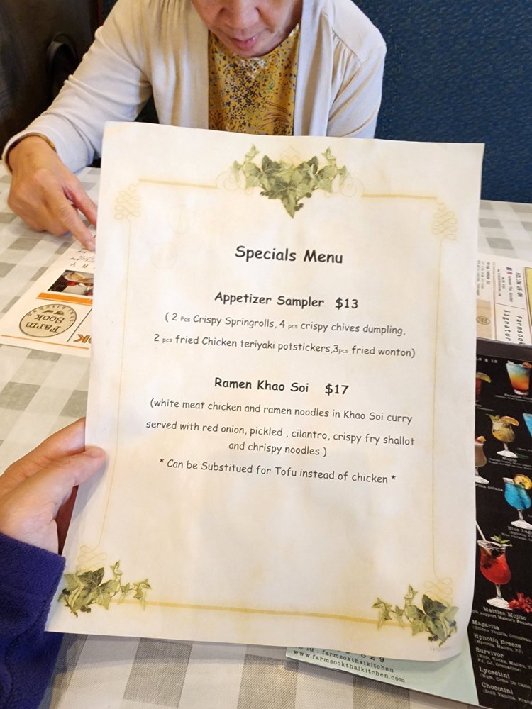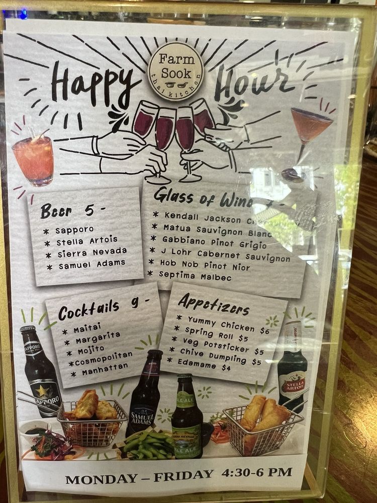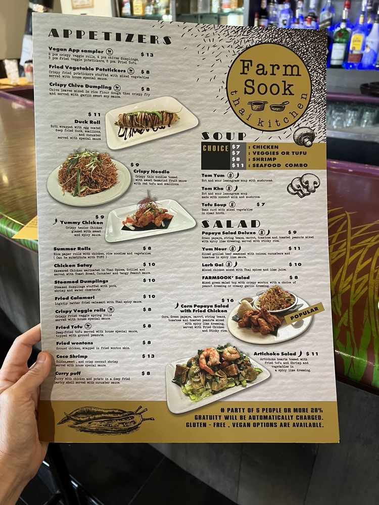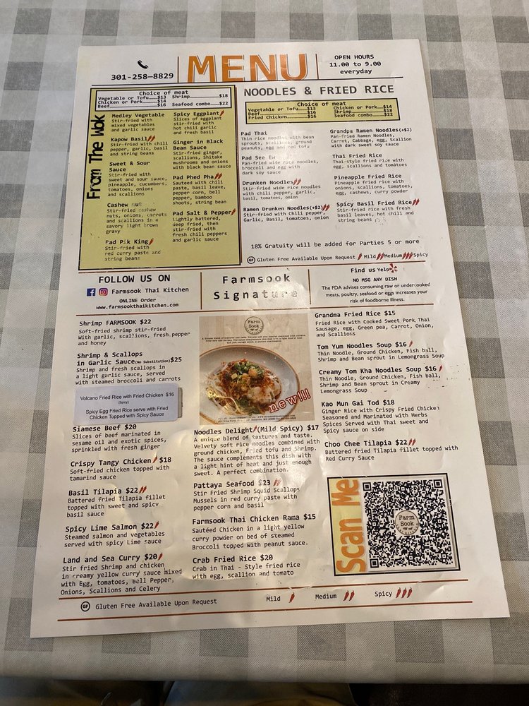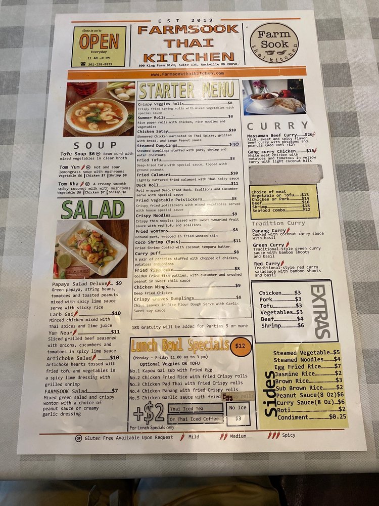 Farmsook Happiness Thai Kitchen offers a delightful dining experience in Rockville, MD. The restaurant boasts a diverse menu featuring noodles, Thai dishes, and refreshing salads. With options for vegan customers and a variety of utilities like delivery and catering, this spot is perfect for any occasion. The flavorful starters like Crispy Veggies Roll and Chicken Satay are a must-try. The Soups, including Tom Yum Soup and Tom Kha Soup, are flavorful and comforting. The Papaya Salad Deluxe and Larb Gai Salad are refreshing and packed with Thai flavors. Customers rave about the exceptional service and the delicious Gang Curry Chicken. The cozy ambiance and friendly staff make Farmsook Happiness Thai Kitchen a top choice for Thai cuisine enthusiasts.